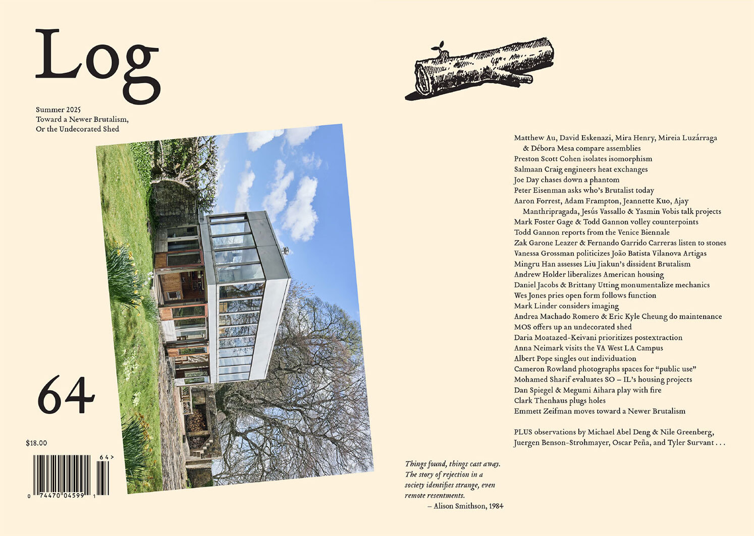 As guest editor Emmett Zeifman wrote in his prompt for Toward a Newer Brutalism, or the Undecorated Shed, “Log 64 appropriates New Brutalism as a found theory of architecture that looks like exactly what it is made of.” To wit, Matthew Au, David Eskenazi, Mira Henry, Mireia Luzárraga and Débora Mesa discuss the assembly of materials, while material flammability is the concern of Dan Spiegel and Megumi Aihara. Clark Thenhaus manipulates 3D printed concrete, Zak Garone Leazer and Fernando Garrido Carreras interrogate stone, Salmaan Craig addresses the properties of heat, and Andrea Machado Romero and Eric Kyle Cheung pose maintenance as a design question. The envelopes of heating and cooling plants are analyzed by Daniel Jacobs and Brittany Utting; Mohamed Sharif heralds SO – IL’s rejection of the double-loaded apartment building corridor; and Anna Neimark celebrates Gehry Associates return to a Brutalist architecture in homes for veterans in West Los Angeles. Housing is also the focus of pieces by both Albert Pope and Andrew Holder, at vastly different scales, while Vanessa Grossman revisits the Brutalist work, including a house, of João Batista Vilanova Artigas. Aaron Forrest, Adam Frampton, Jeannette Kuo, Ajay Manthripragada, Jesús Vassallo and Yasmin Vobis talk with Emmett Zeifman about their work; Mark Foster Gage and Todd Gannon exchange views on Brutalism today, and Mark Linder reconsiders Alison and Peter Smithson’s “brutal intelligence” and “vulgar sophistication.” Mingru Han assess Liu Jaikun’s Chinese Brutalism, Preston Scott Cohen makes an argument for isomorphism, Joe Day posits a brut nouveau, and Peter Eisenman asks who’s Brutalist today. Wes Jones probes the meaning of form follows function, MOS draws up an undecorated shed, Daria Moatazed-Keivani builds with students, and Cameron Rowland documents “public use.” In assembling these voices under the rubric of Newer Brutalism, Zeifman writes, “Naming something provokes debate over the definition of terms, sustaining critical discourse and advancing architecture toward a conscious relationship to its history, limits, and potentials.”